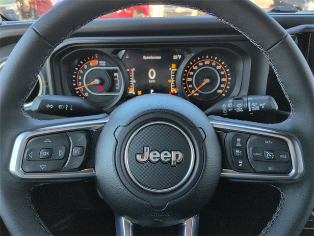 Quick Order Package 22G, Safety Group (Auto High Beam Headlamp Control, Blind Spot & Cross Path Detection, and ParkSense Rear Park Assist System), Technology Group (12.3" Touchscreen Display, 4G LTE Wi-Fi Hot Spot, Apple CarPlay, Auto-Dimming Rear-View Mirror, Connected Travel & Traffic Services, Connectivity - US/Canada, For More Info, Call 800-643-2112, Google Android Auto, GPS Navigation, HD Radio, Integrated Center Stack Radio, Integrated Off-Road Camera, Integrated Voice Command w/Bluetooth, Radio: Uconnect 5 Nav w/12.3" Display, SiriusXM Radio Service, SiriusXM w/360L, and Universal Garage Door Opener), 3.45 Overall Top Gear Ratio, 4-Wheel Disc Brakes, 8 Speakers, ABS brakes, Air Conditioning, Alloy wheels, Alpine Premium Audio System, AM/FM radio: SiriusXM with 360L, Apple CarPlay/Android Auto, Automatic temperature control, Aux Battery, Brake assist, Cloth Low-Back Bucket Seats, Compass, Delay-off headlights, Driver door bin, Driver vanity mirror, Dual front impact airbags, Dual front side impact airbags, Electronic Stability Control, Emergency communication system: Jeep Connect, Front anti-roll bar, Front Bucket Seats, Front Center Armrest w/Storage, Front dual zone A/C, Front fog lights, Front License Plate Bracket, Front reading lights, Fully automatic headlights, Heated door mirrors, Heated front seats, Heated steering wheel, Heavy Duty Suspension w/Gas Shocks, Illuminated entry, Integrated roll-over protection, Low tire pressure warning, MOPAR All-Weather Floor Mats, Non-Lock Fuel Cap w/o Discriminator, Occupant sensing airbag, Outside temperature display, Overhead airbag, Panic alarm, ParkView Rear Back-Up Camera, Passenger door bin, Passenger vanity mirror, Power door mirrors, Power steering, Power Top Quarter Window Storage Bag, Power windows, Radio data system, Radio: Uconnect 5 w/12.3" Display, Rear anti-roll bar, Rear reading lights, Rear Window Defroster, Rear Window Wiper/Washer, Remote keyless entry, Removable Rear Quarter Windows, Security system, Sky One-Touch Power Top, Speed control, Split folding rear seat, Steering wheel mounted audio controls, Stop-Start Dual Battery System, Tachometer, Telescoping steering wheel, Tilt steering wheel, Traction control, Trip computer, Variably intermittent wipers, Voltmeter, and Wheels: 18" x 7.5" Machine/Painted Gray.