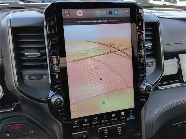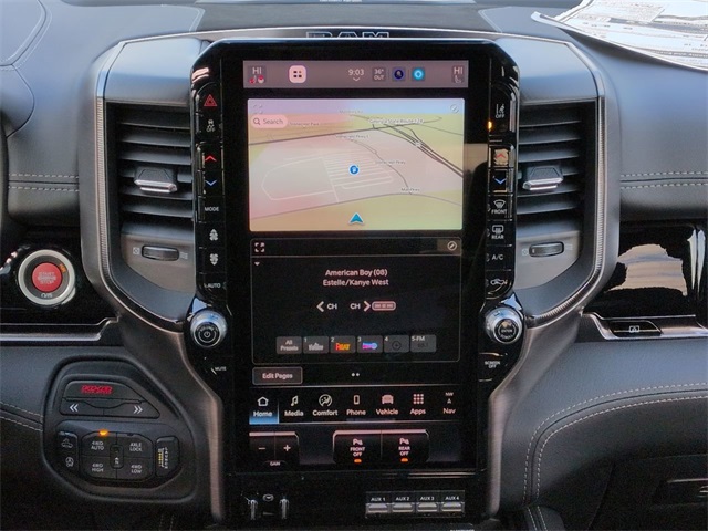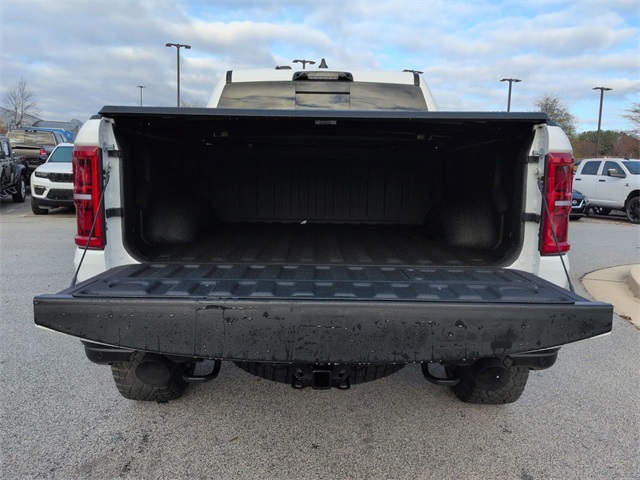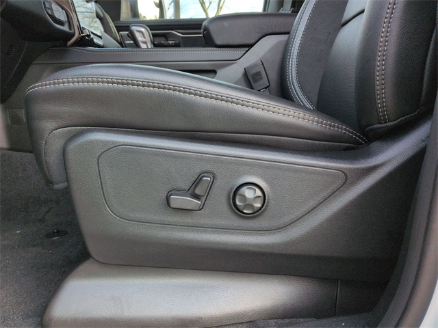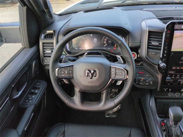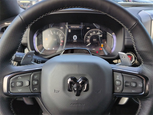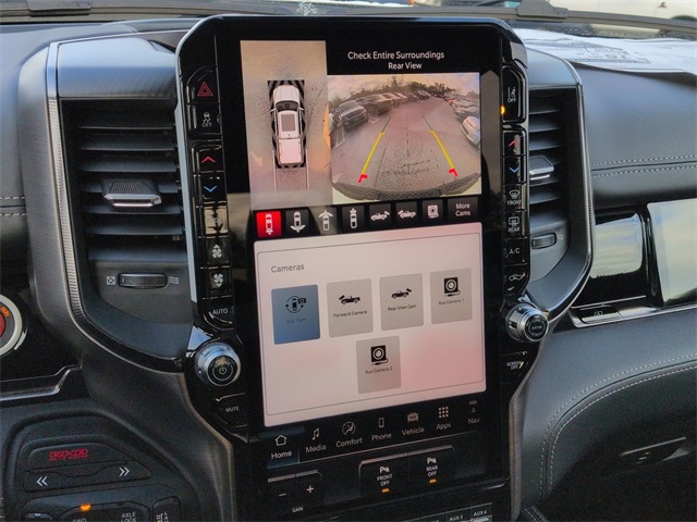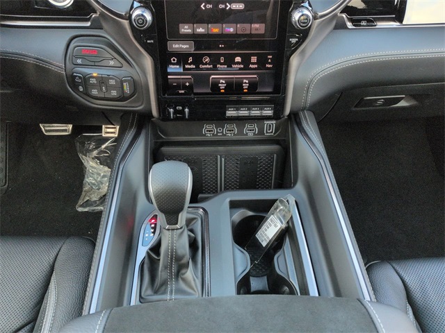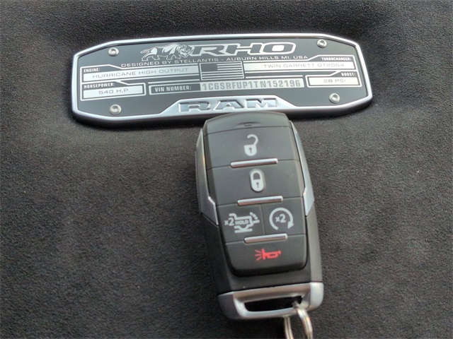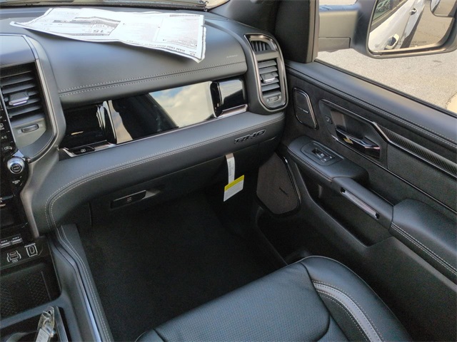 Quick Order Package 22Y RHO, RHO Level 1 Equipment Group (12-Way/1-Way Trailer Connector, 14.4" Touchscreen Display, 240 Amp Alternator, 4G LTE Wi-Fi Hot Spot, Connected Travel and Traffic Services, Connectivity - US/Canada, Disassociated Touchscreen Display, Driver Power Seat Back Massage, Driver Seat Memory, Driver/Passenger Wrapped Assist Handles, Drowsy Driver Detection, Dual Wireless Charging Pad, Evasive Steer Assist, Exterior Mirrors with Memory, Front Passenger Interactive Display, Front Passenger Power Seat Back Massage, Full Length Premium Upgraded Floor Console, GPS Navigation, Hands-Free Active Driving Assist System, Harman/Kardon 19 Speaker Premium Sound, HD Radio, Heads-Up Display, Heated Second Row Seats, Integrated Center Stack Radio, Integrated Voice Command with Bluetooth, Intersection Collision Assist System, Leather/Carbon Flat-Bottom Steering Wheel, LED CHMSL Lamp, Luxury Front Door Trim Panel, Power Adjustable Pedals with Memory, Power Tailgate, Premium Wrapped Instrument Panel Bezel, Radio: Uconnect 5 Nav with 14.4" Display, Radio/Driver Seat/Mirrors/Pedals Memory, Rain Sensitive Windshield Wipers, Real Carbon Fiber Interior Accents, Rear 60/40 Folding Split Recline Seat, SiriusXM Radio Service, Smartphone as a Key Capable, Surround View Camera System, Traffic Sign Recognition, USB Host Flip, Ventilated Front Seats, and Ventilated Rear Seats), 10 Speakers, 3.92 Rear Axle Ratio, 4-Wheel Disc Brakes, ABS brakes, Adaptive suspension, Adjustable pedals, Air Conditioning, Alloy wheels, AM/FM radio, Apple CarPlay/Android Auto, Auto High-beam Headlights, Auto Power-Folding Mirrors, Auto-dimming door mirrors, Auto-Dimming Exterior Driver Mirror, Auto-dimming Rear-View mirror, Automatic temperature control, Brake assist, Compass, Delay-off headlights, Dome Dual LED Reading Lamp, Driver door bin, Driver vanity mirror, Dual front impact airbags, Dual front side impact airbags, Dual-Pane Panoramic Sunroof, Electronic Stability Control, Exterior Mirrors Courtesy Lamps, Exterior Mirrors with Heating Element, Exterior Mirrors with Supplemental Signals, Exterior Parking Camera Rear, Flareside Box, Front anti-roll bar, Front Bucket Seats, Front Center Armrest w/Storage, Front dual zone A/C, Front fog lights, Front reading lights, Front wheel independent suspension, Fully automatic headlights, Garage door transmitter, Heated door mirrors, Heated front seats, Heated steering wheel, Illuminated entry, Leather Shift Knob, Leather steering wheel, Leather Trimmed Bucket Seats, Low tire pressure warning, Navigation System, Occupant sensing airbag, Outside temperature display, Overhead airbag, Overhead console, Panic alarm, Passenger door bin, Passenger vanity mirror, Power door mirrors, Power driver seat, Power passenger seat, Power steering, Power windows, Radio data system, Radio: Uconnect 5 Navigation with 12.0" Display, Rear reading lights, Rear seat center armrest, Rear step bumper, Rear window defroster, Remote keyless entry, Security system, Speed control, Split folding rear seat, Sport steering wheel, Steering wheel mounted audio controls, Tachometer, Telescoping steering wheel, Tilt steering wheel, Traction control, Tri-Fold Tonneau Cover, Trip computer, Turn signal indicator mirrors, Variably intermittent wipers, Voltmeter, and Wheels: 18" x 9" Black Paint/Polish Aluminum.